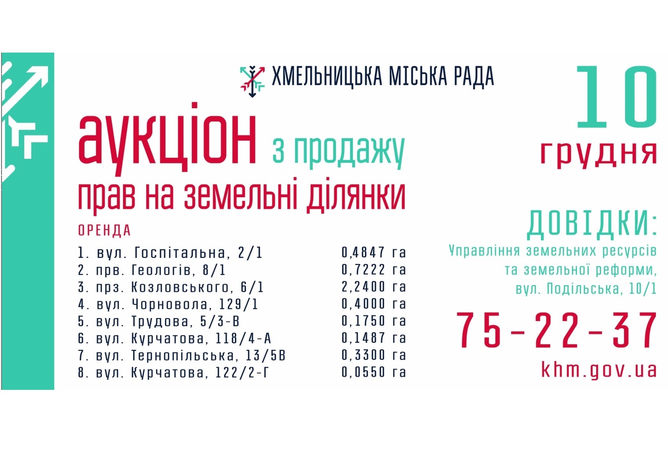 10 грудня об 11.00 у торговому залі товарної біржі «Подільська» (вул. Героїв Майдану, 10) відбудуться земельні торги у формі аукціону з продажу прав на земельні ділянки у місті Хмельницькому.