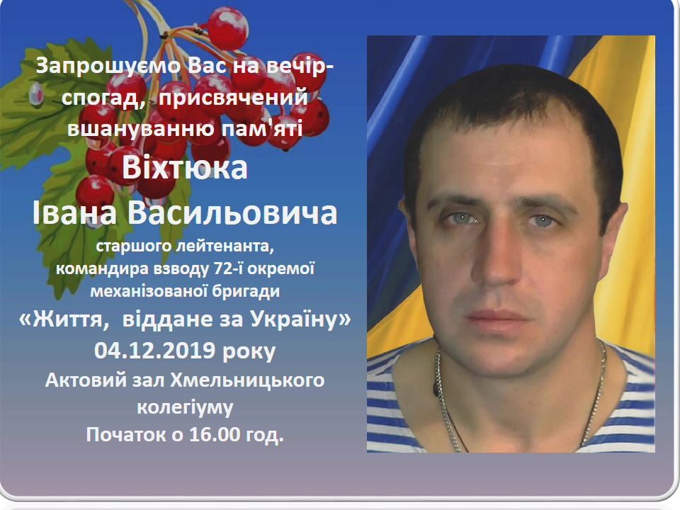 4 грудня о 16.00 в актовому залі Хмельницького колегіуму ім. В.Козубняка відбудеться вечір-спогад присвячений вшануванню пам'яті старшого лейтенанта, командира взводу 72-ї окремої механізованої бригади Івана Васильовича Віхтюка.