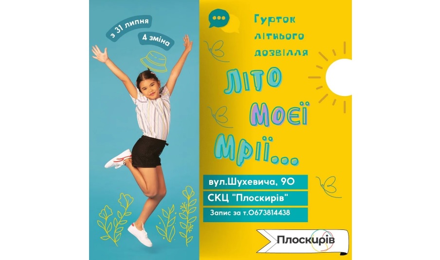 З 30 липня до 11 серпня в СКЦ "Плоскирів" (вул. Шухевича, 90) працюватиме літній табір для дітей віком 6-14 років.