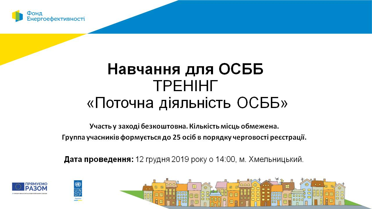 Перший навчальний тренінг «Налагодження роботи та поточна діяльність ОСББ» відбудеться 12 грудня (четвер) 2019 року о 14:00, за адресою: м. Хмельницький, вул. Проскурівська, 1, кімната 203 зал засідань (2-й поверх, приміщення управління житлово-комунального господарства Хмельницької міської ради).