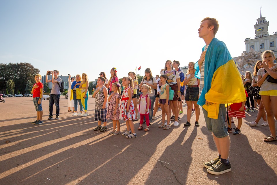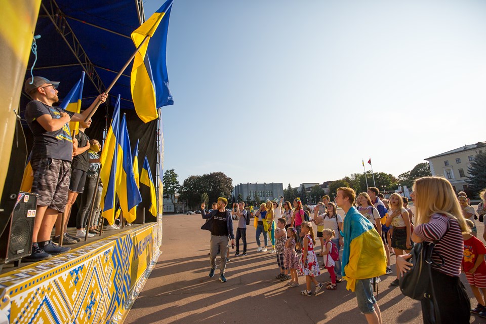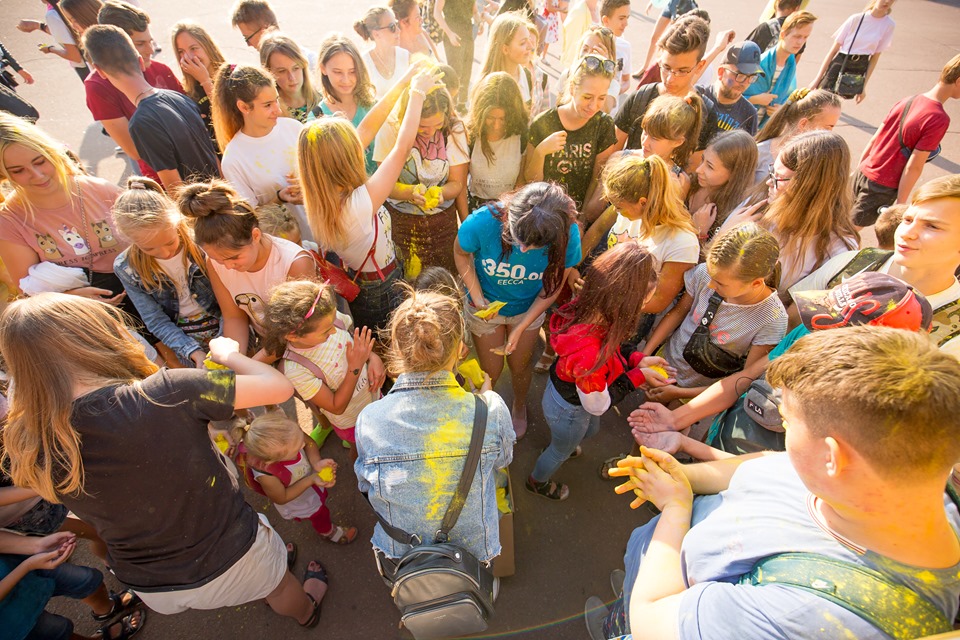 Хмельницька молодь на День Державного Прапора організувала флешмоб - кольоровий забіг із фарбами холі. Веселі та усміхнені учасники акції зібралися на майданчику біля кінотеатру ім.Т.Шевченка і звідти по вулицях Проскурівській та Соборній пробіглися до майдану Незалежності, де влаштували акцію із фарбами двох кольорів – жовтим та синім – кольорами українського прапора.