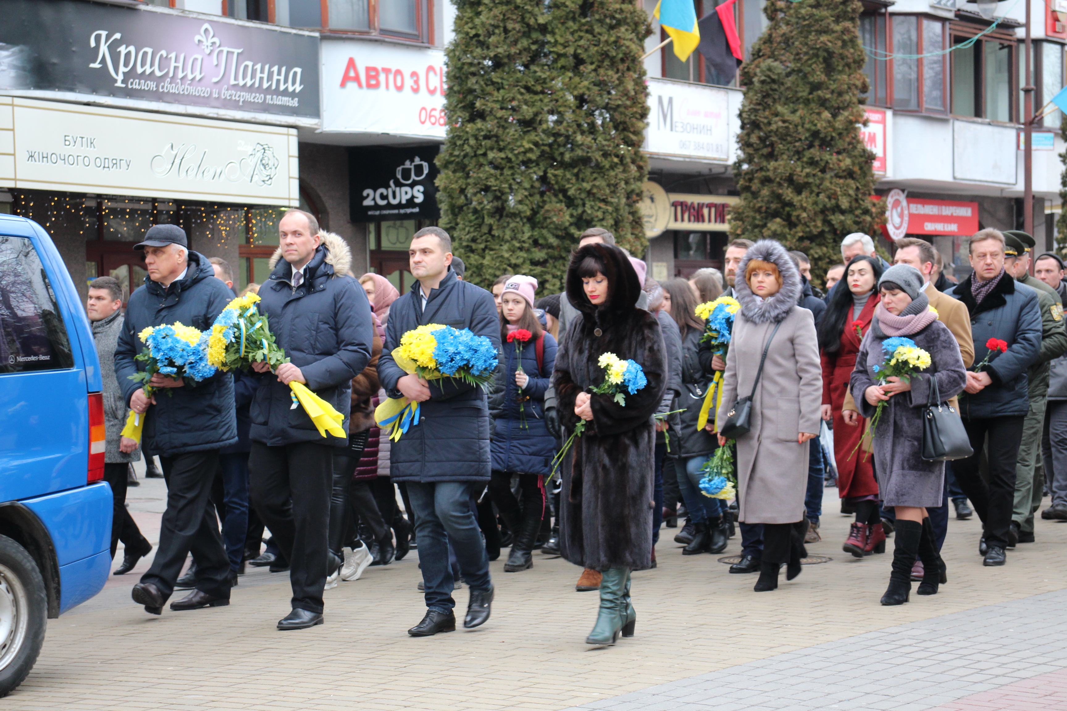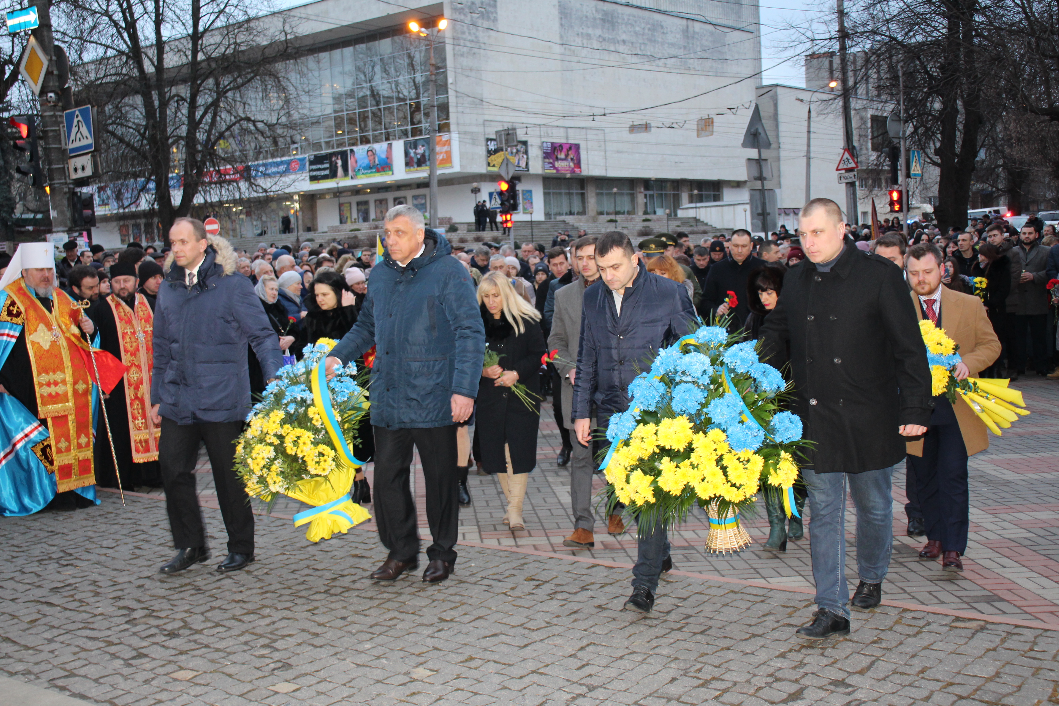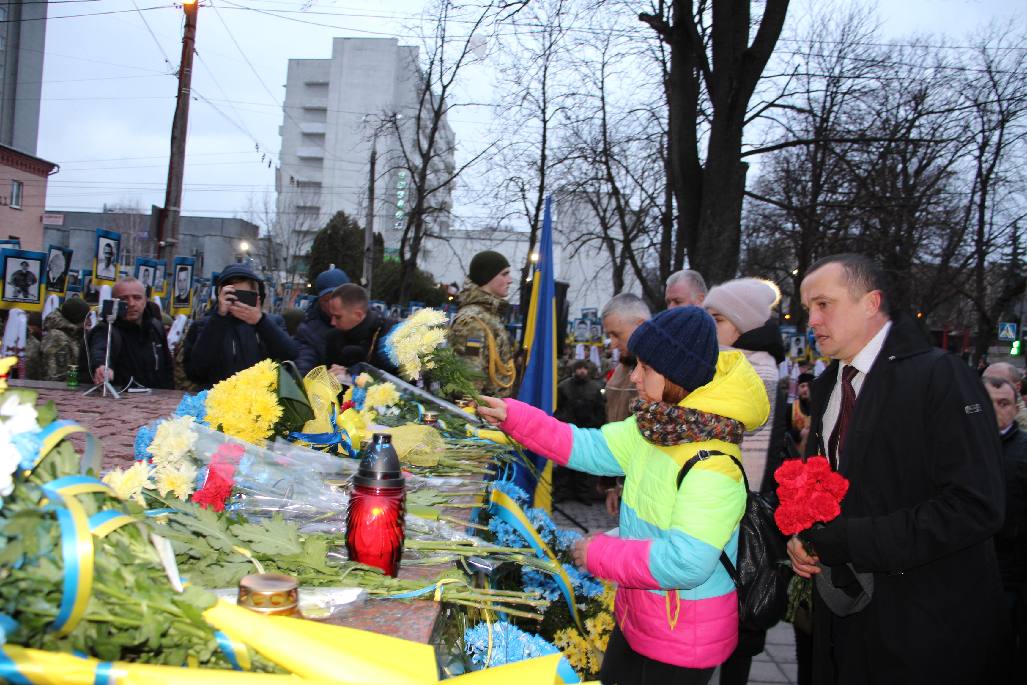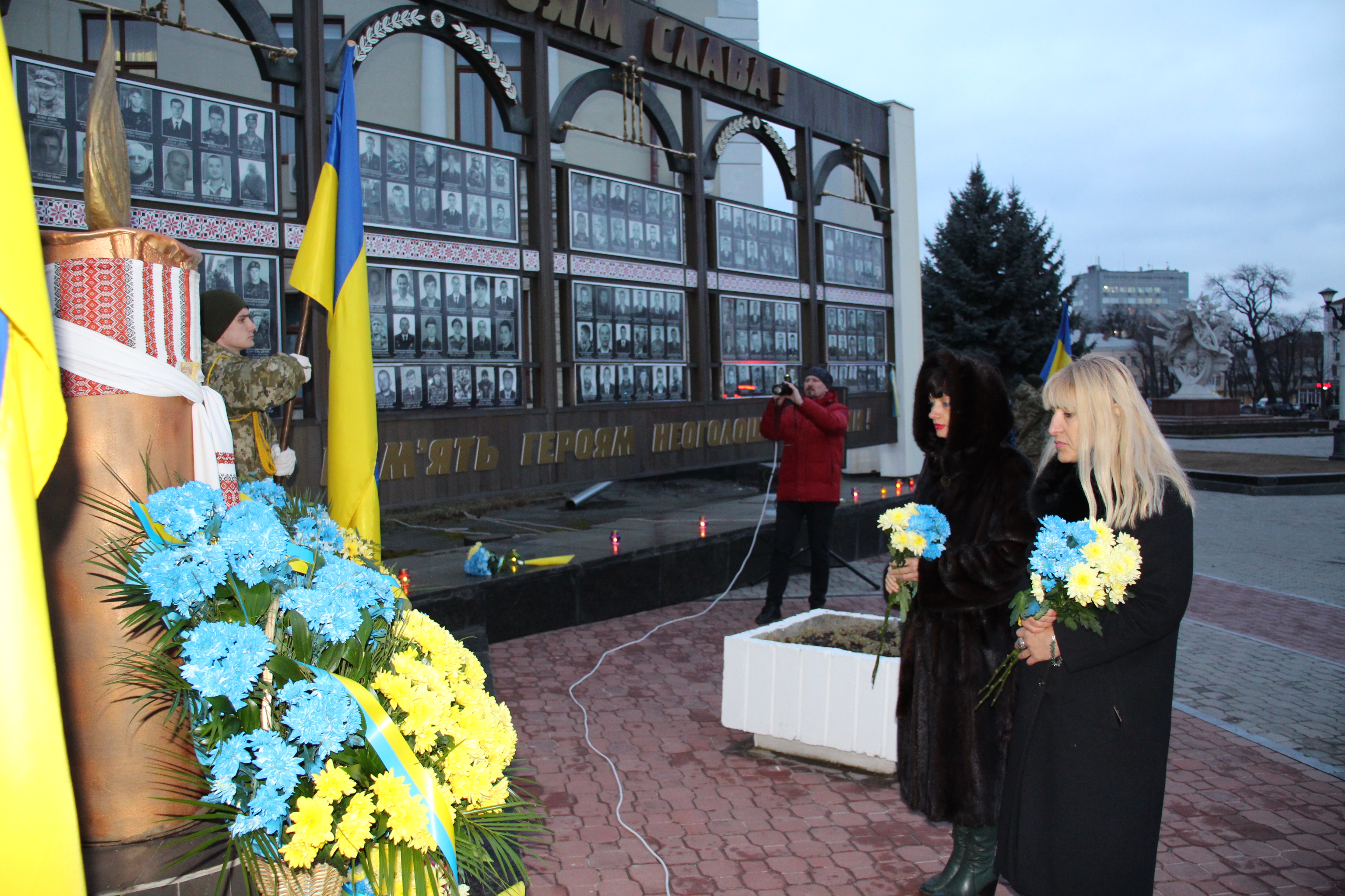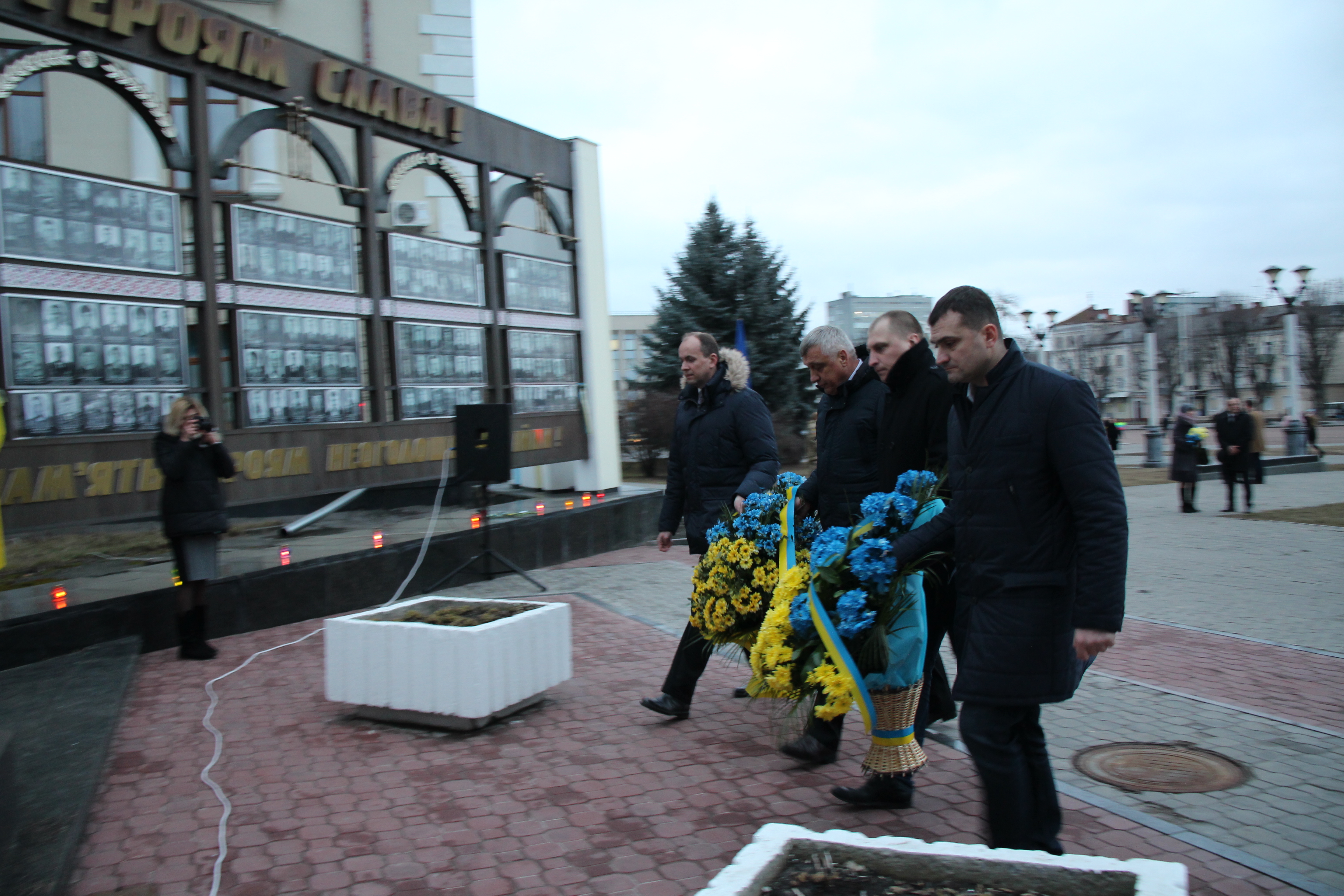 Квіти до пам’ятника Героям Небесної Сотні та Меморіальної дошки пам’яті Героїв Небесної Сотні та учасників АТО поклали учасники Революції Гідності та антитерористичної операції, родини загиблих Героїв Небесної Сотні та учасники Операції об’єднаних сил на Сході України, керівники міста й області, депутати міської та обласної рад, представники духовенства, громадськість міста.