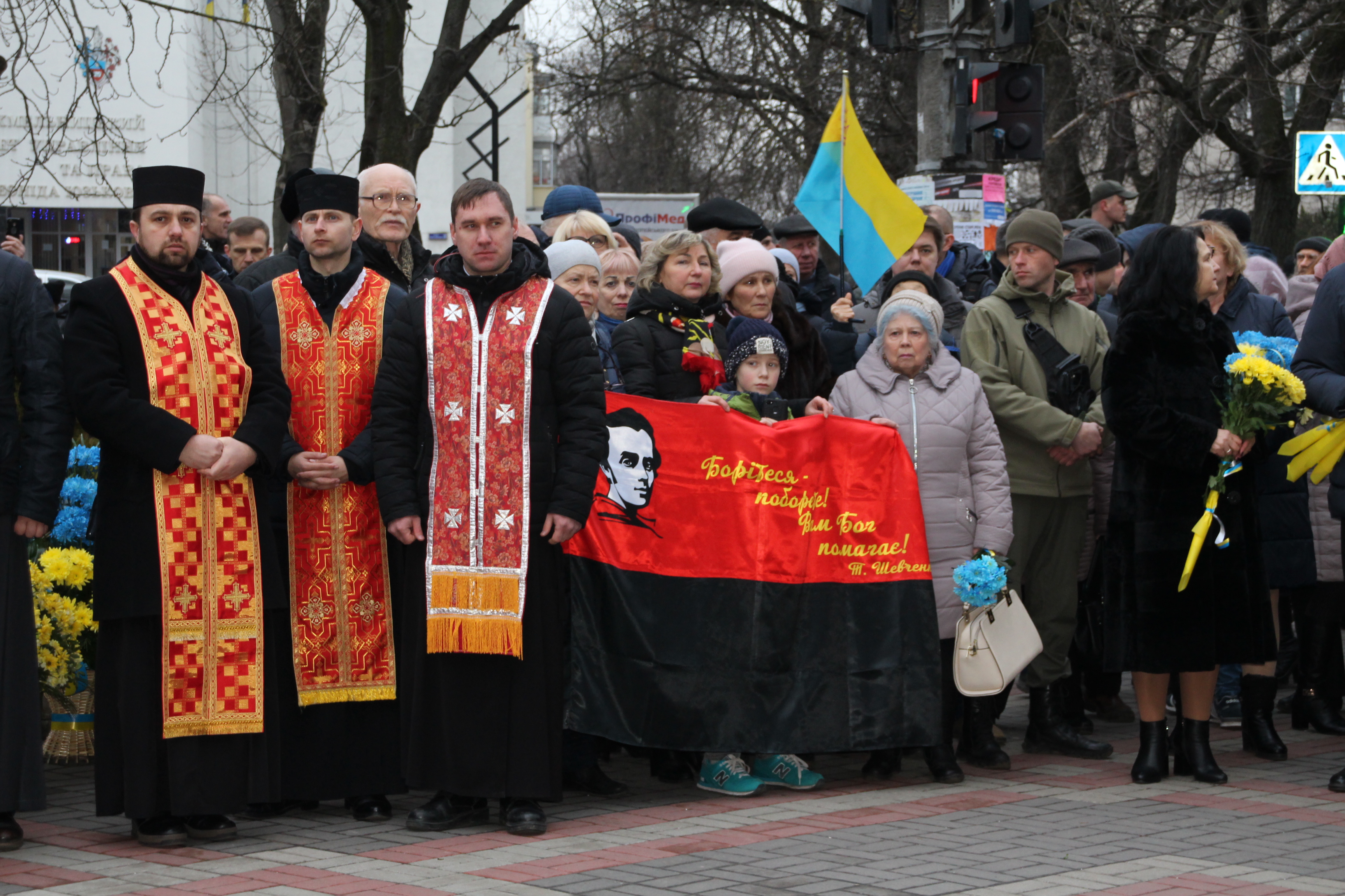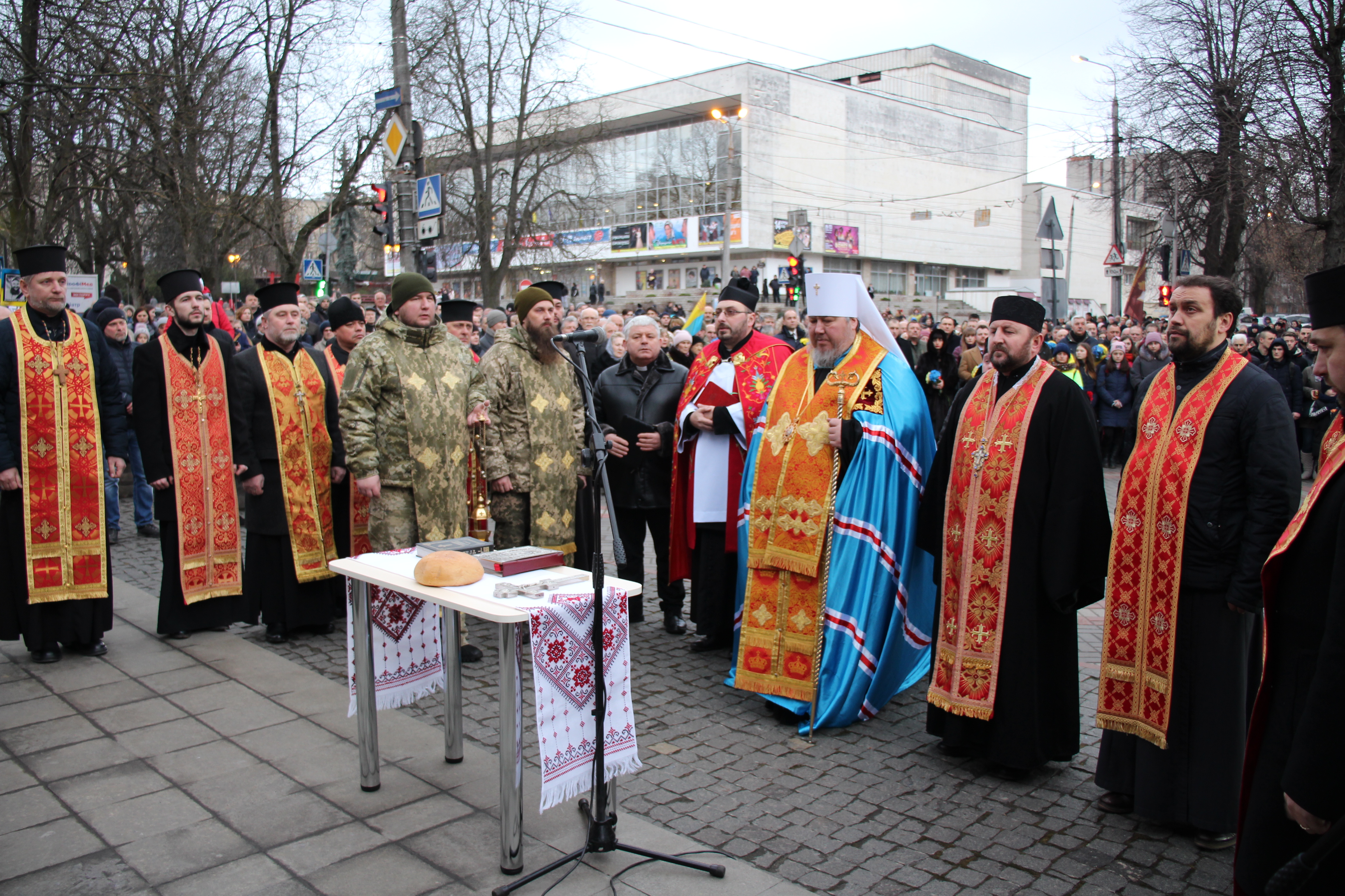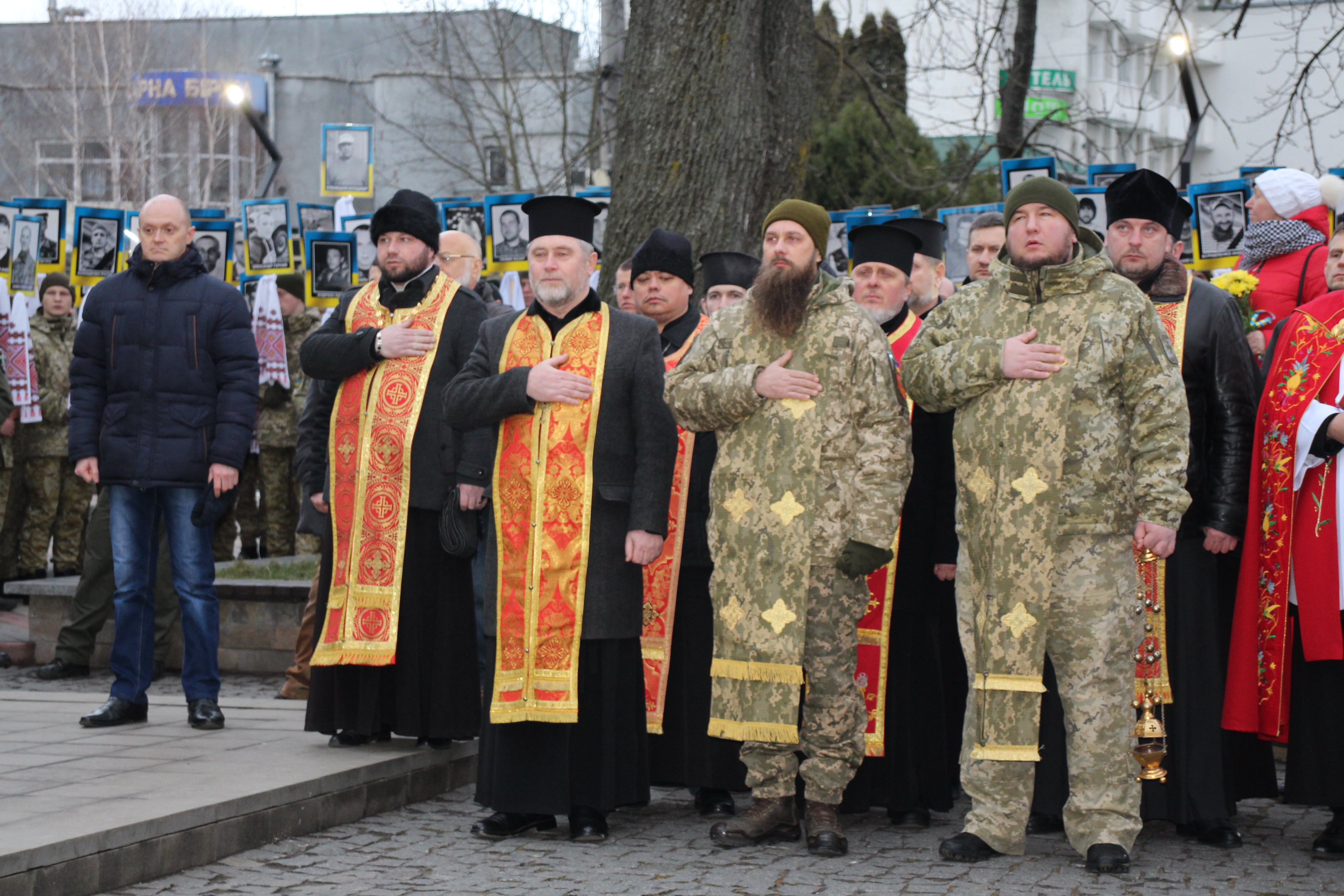 Традиційно біля пам’ятника Героям Небесної Сотні присутні вшанували загиблих хвилиною мовчання, представники духовенства відправили панахиду за загиблими героями та помолилися за Україну.