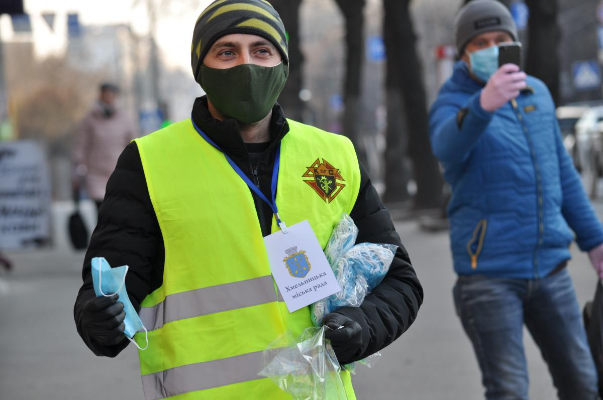 Для забезпечення хмельничан масками працівники Хмельницької міської ради та волонтери протягом усього тижня роздають маски на зупинках громадського транспорту у різних мікрорайонах міста. Кожен бажаючий міг безкоштовно отримати засоби індивідуального захисту. Загалом уже роздано понад 7 тисяч масок.