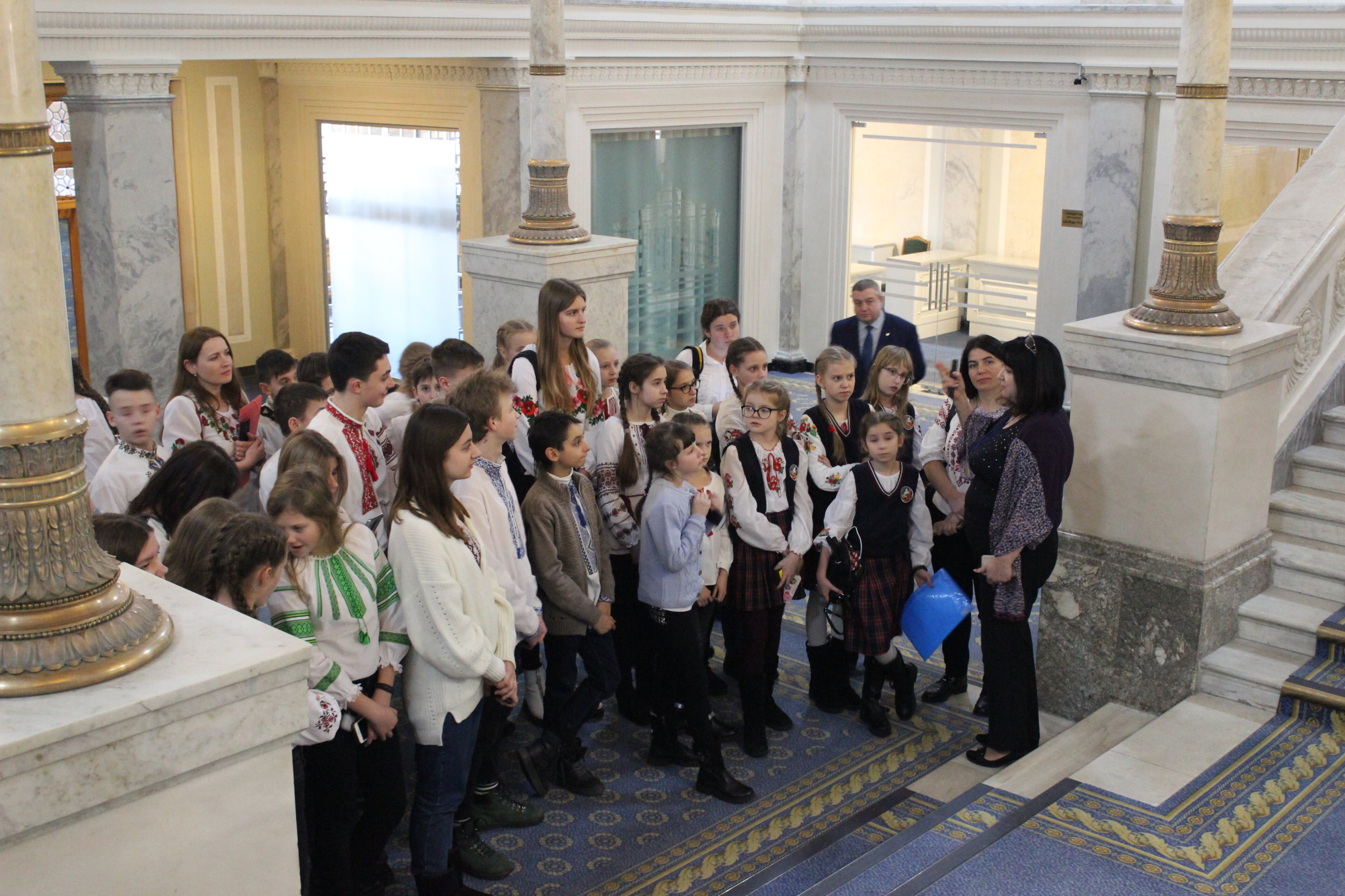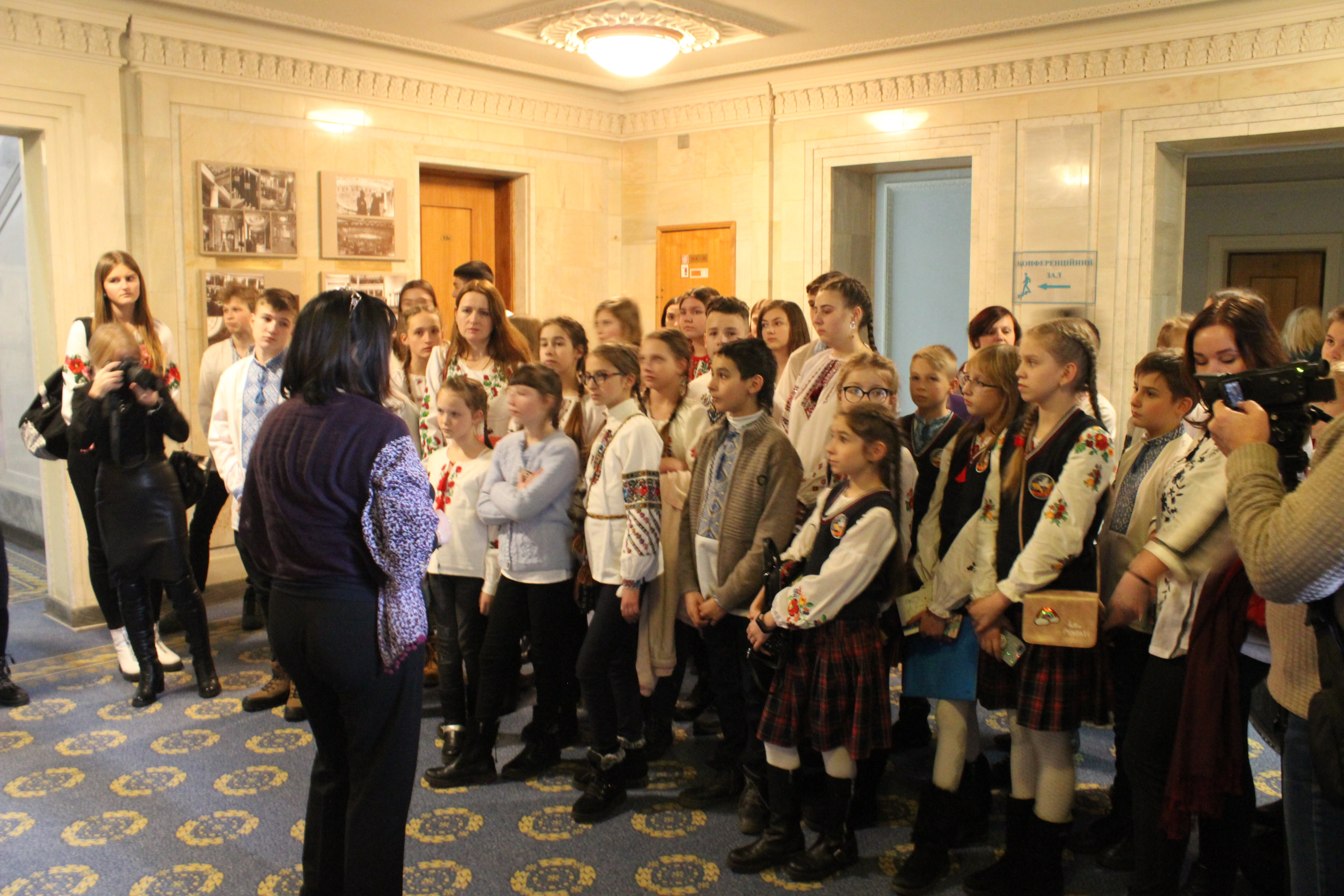 Під час екскурсії школярі дізналися цікаві моменти з історії будівлі Верховної Ради України. Так, конкурс на кращий проект будівництва сесійної зали був оголошений у лютому 1936 року. В ньому переміг відомий український архітектор Володимир Загородній. Будівлю парламенту зводили три роки. За час свого існування вона зазнала декількох реконструкцій. У роки Другої світової війни до сесійної зали через купол потрапила авіаційна бомба, проте вона не вибухнула, а лише спричинила пожежу. Реконструкція проводилася й у 1948-1952 роках. Тоді до основної будівлі добудували так зване півкільце — підкову з внутрішнім двориком, а купол підняли на метр вище, що покращило пропорції будівлі. Наступні реконструкції проходили у 1985 і 2000 роках. Останню провели влітку 2018 року.