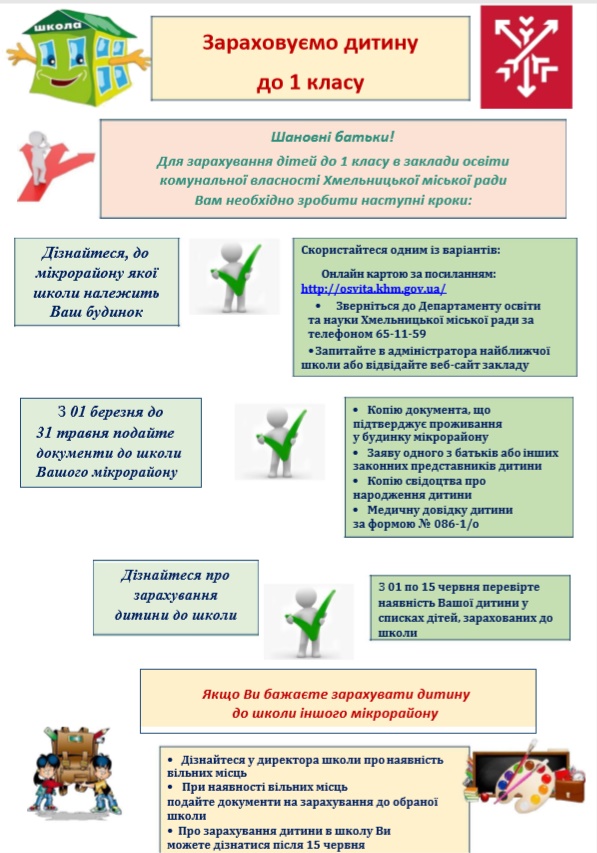 За інформацією Департаменту освіти та науки Хмельницької міської ради заяву про зарахування дитини у 2020/2021 навчальному році до першого класу закладу загальної середньої освіти міста, за яким закріплена територія обслуговування, на якій проживає ця дитина, та необхідні документи подаються до відповідного закладу одним з батьків або інших законних представників дитини особисто, починаючи з 01 березня до 31 травня 2020 року.