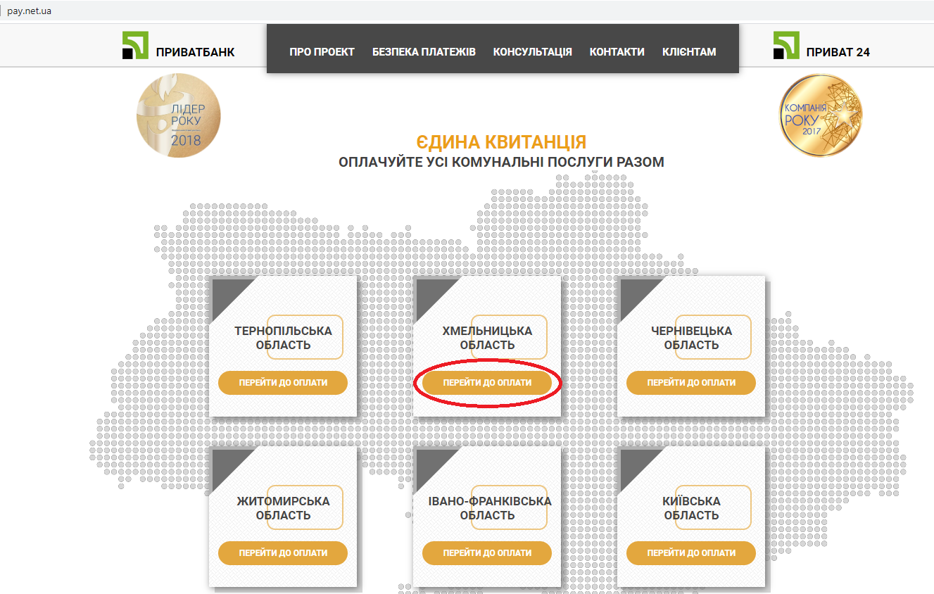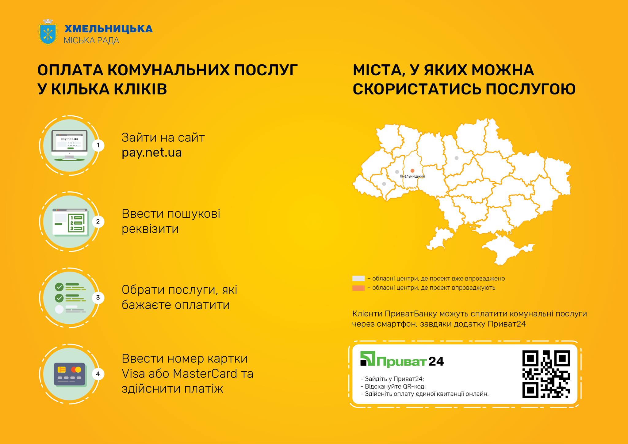 Сплатити комунальні послуги по місту та Хмельницькій області, не виходячи з дому, з мінімальною комісією можна на сайті pay.net.ua карткою будь-якого банку.