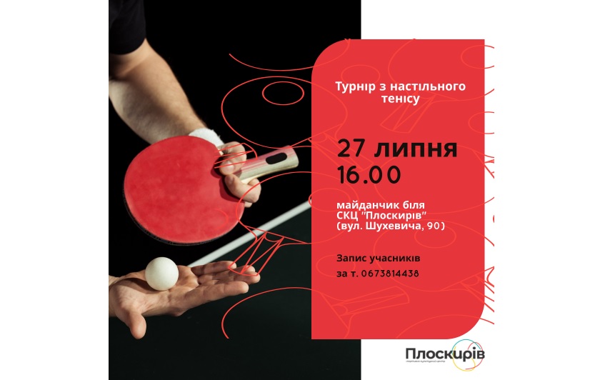 27 липня о 16:00 на майданчику поряд з СКЦ "Плоскирів" (вул. Шухевича, 90) відбудеться черговий турнір з настільного тенісу, на який запрошують усіх любителів цього виду спорту.