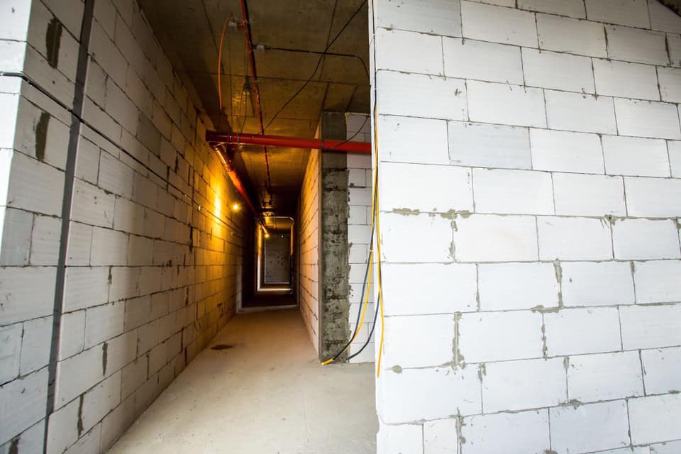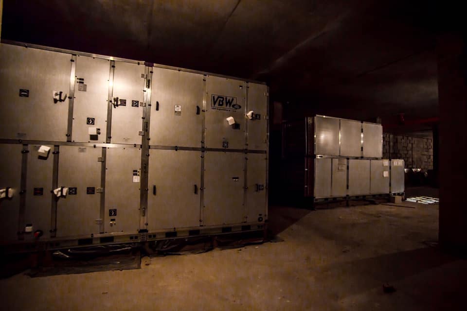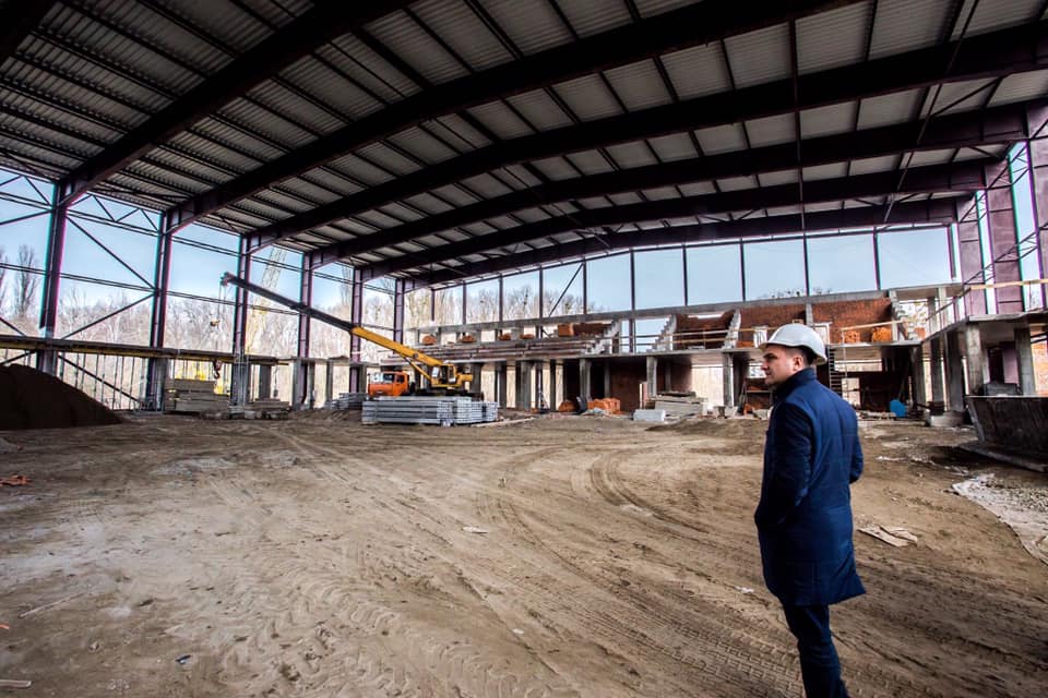 Адміністративно-спортивно-господарська будівля вже з вентиляцією, монтується електрика, усі об’ємні будівельні роботи завершені. До слова, тут, окрім адміністративних, медичних, розважальних, господарських приміщень, роздягалень, тренажерних залів є чотири зали площею 290 кв. м.