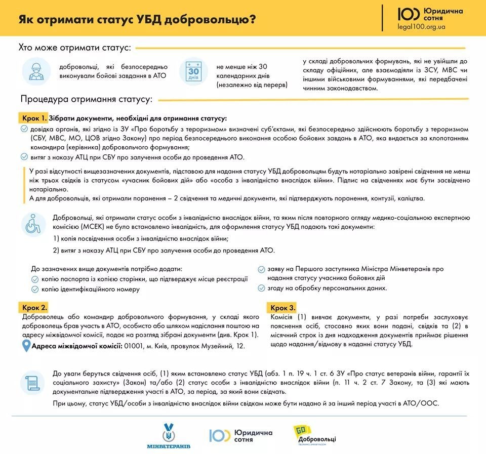 Також додаємо покрокову інструкцію від ГО Юридична сотня для подання документів для отримання статусу УБД з наочною інфографікою.