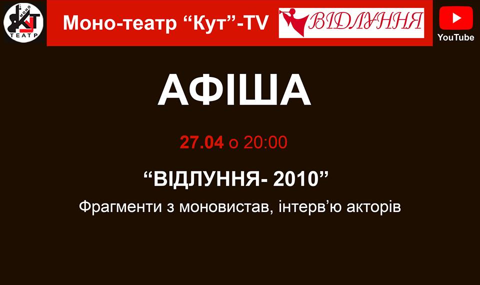27 квітня о 20:00 на YouTube каналі Хмельницького монотеатру "Кут" відбудеться трансляція фрагментів моновистав та інтерв'ю акторів фестивалю "Відлуння 2010".